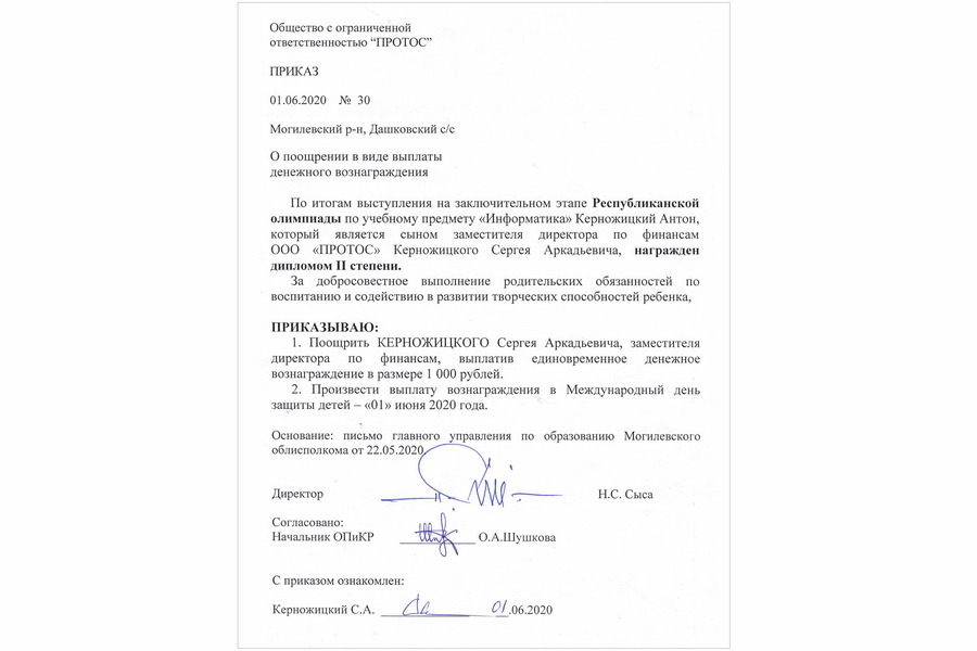 Пользуясь случаем хотим поздравить заместителя директора по финансам Керножицкого Сергея Аркадьевича с победой его сына Керножицкого Антона на республиканской олимпиаде. Больших успехов и творческих побед!