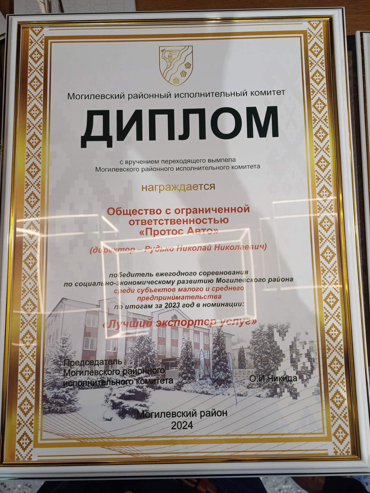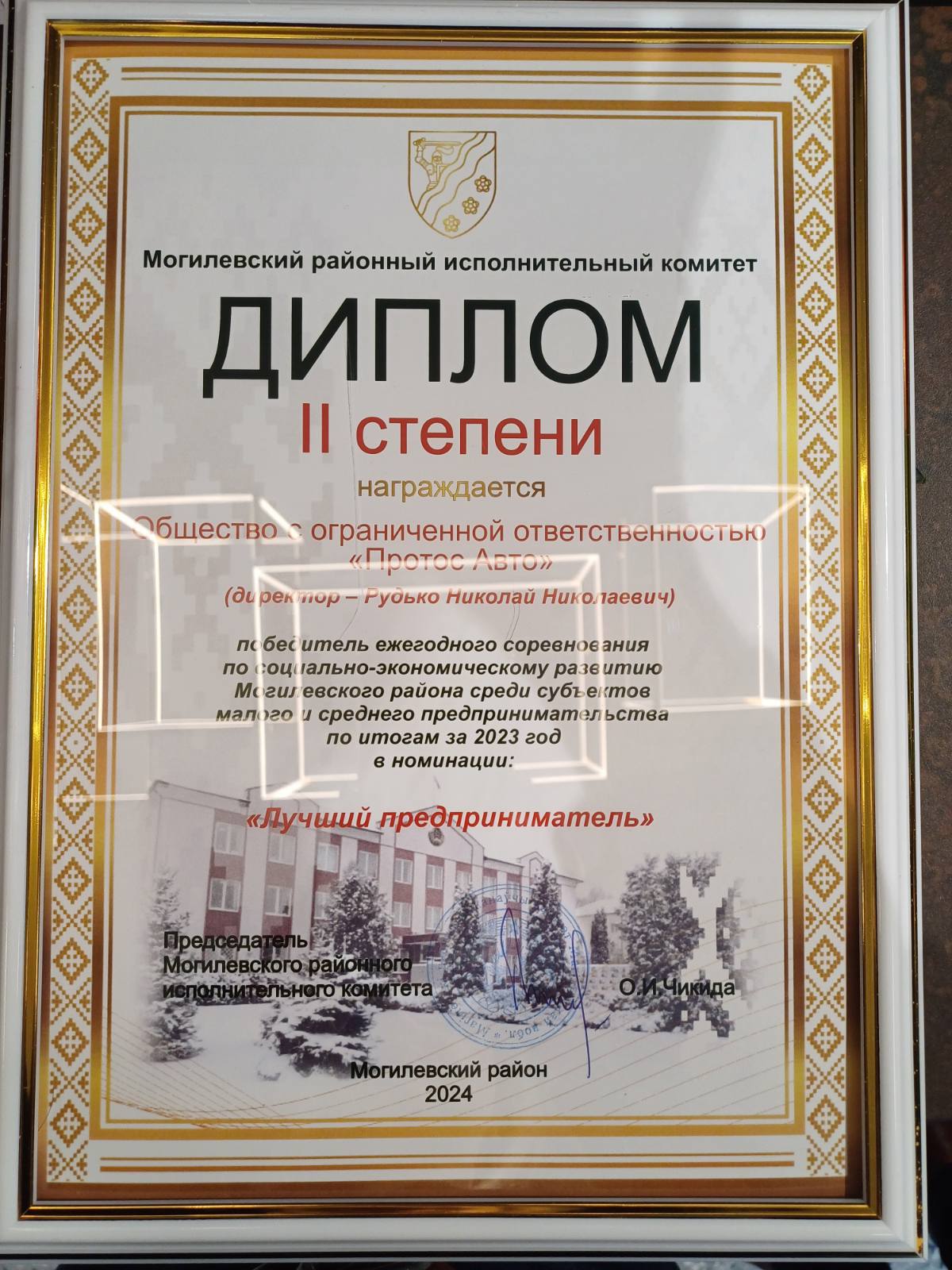 По итогам ежегодного конкурса социально-экономического развития Могилёвского района за 2023 год Могилевский районный исполнительный комитет отметил общество с ограниченной ответственностью Протос Авто и его директора Рудько Николая Николаевича выдающимися достижениями в развитии экономики района.