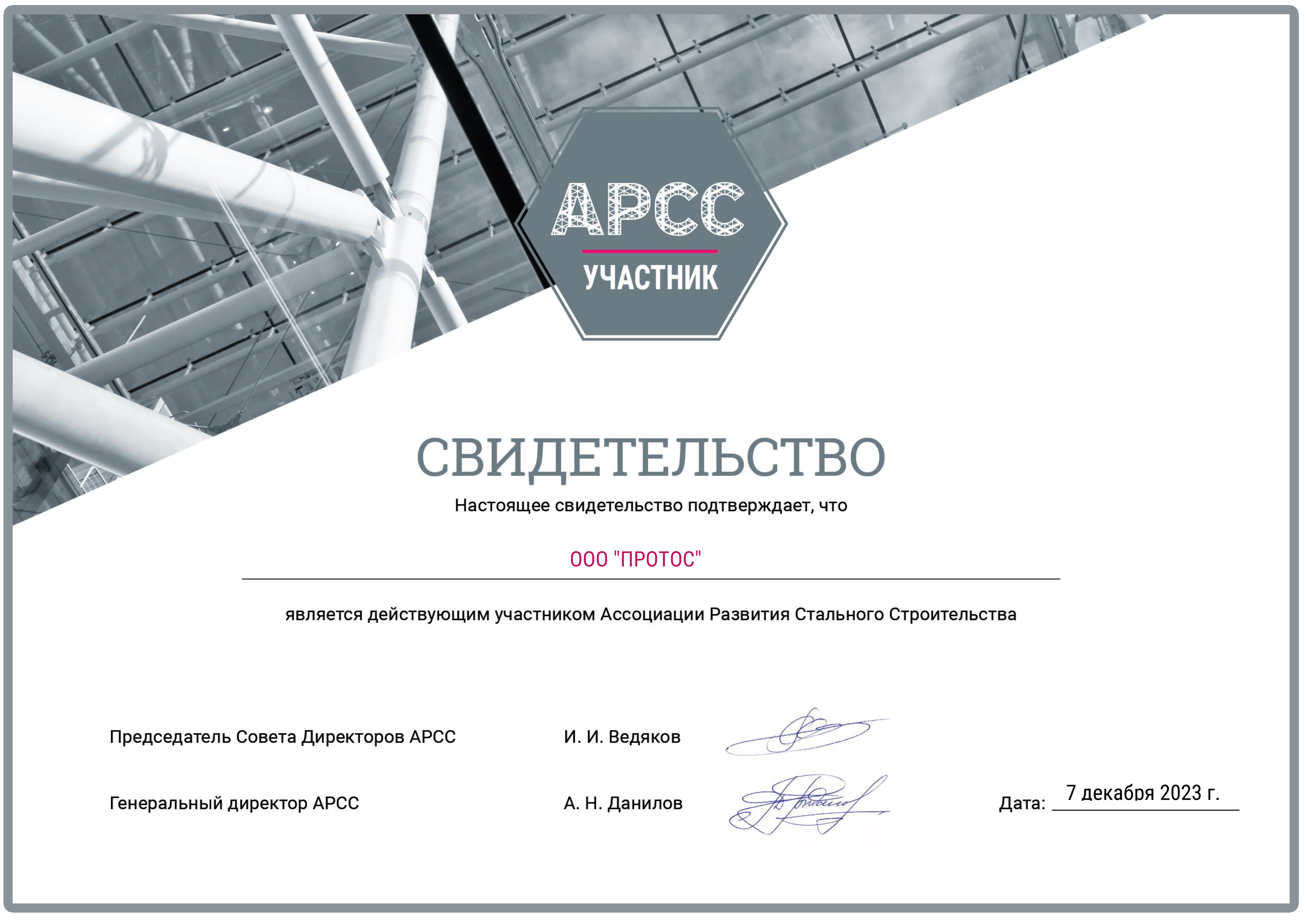 Завод "ПРОТОС" принят в число членов Ассоциации развития стального строительства на основании решения внеочередного Общего собрания членов Ассоциации.