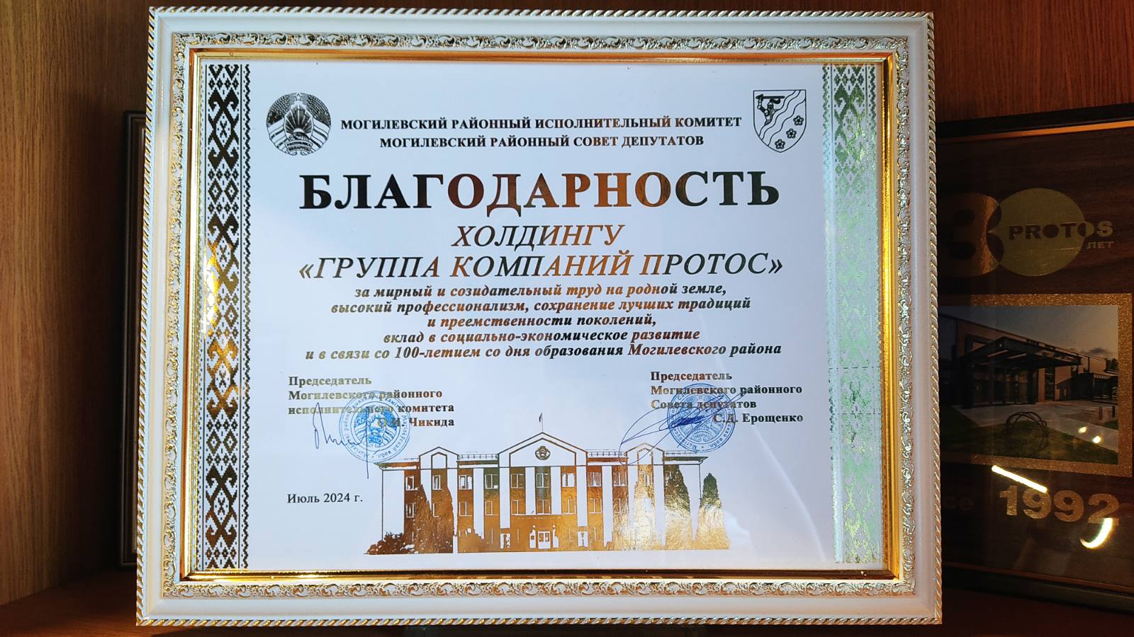 В Могилевском районе состоялась церемония награждения, организованная в рамках пленарного заседания районного инвестиционного форума «Могилевский район – территория возможностей». Холдингу «Группа компаний Протос» вручена Благодарность за созидательный труд, высокий профессионализм и вклад в социально-экономическое развитие региона.