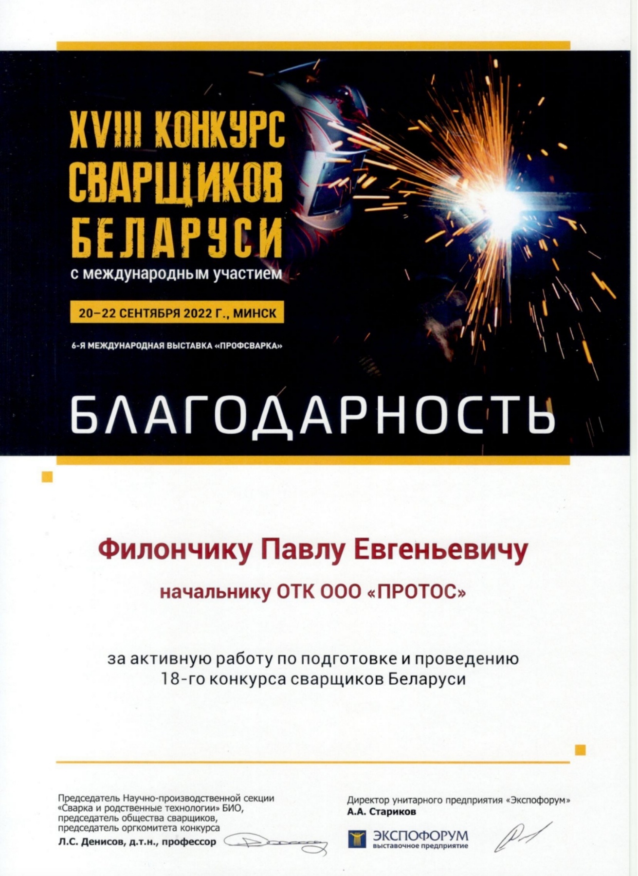 Начальник Отдела Технического Контроля ООО "ПРОТОС" Филончик Павел Евгеньевич был приглашён в качестве члена жюри.